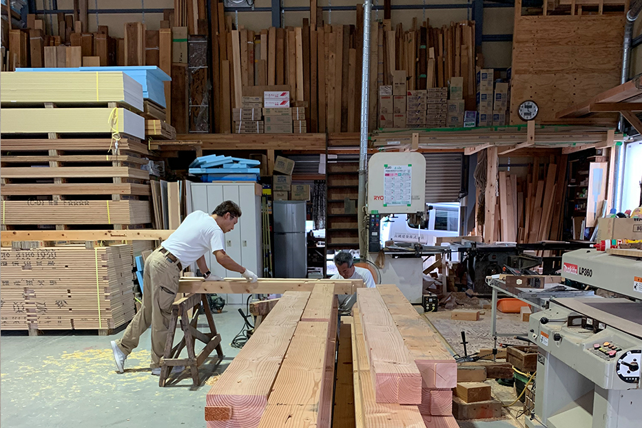 長縄建築では構造材から内装材・家具など、自社工場で加工しております。